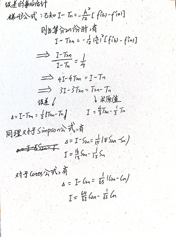 根据上述提到的误差事后估计算法,做出如下公式总结 \[ \begin{cases} \varDelta = I - I_n = \frac13(T_{2n} - T_n)\\ I = \frac43T_{2n} - \frac13T_n \end{cases} \begin{cases} \varDelta = I - I_n = \frac{1}{15}(S_{2n} - S_n)\\ I = \frac{16}{15}S_{2n} - \frac{1}{15}S_n \end{cases} \begin{cases} \varDelta = I - I_n = \frac{1}{63}(C_{2n} - C_n)\\ I = \frac{64}{63}C_{2n} - \frac{1}{63}C_n \end{cases} \]