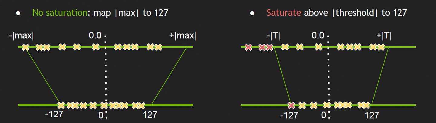 非饱和量化的阈值选取方法能够将所有数据都映射到INT8数据域中,但非零点对称的分布会造成映射空间的浪费
